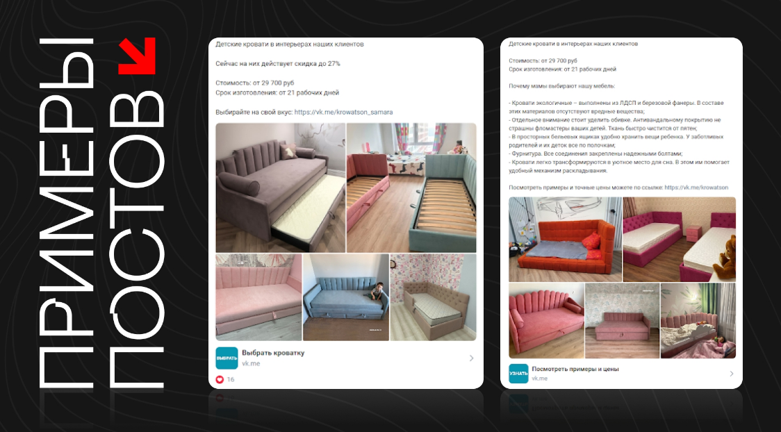 Напомним, что связку из данной статьи мы обкатали как в крупных городах, так и в регионах. И она стабильно даёт отличный результат. Эта схема работает и для корпусной мебели, и для мягкой. И для производителей, и для поставщиков. Бюджеты и вводные данные также могут быть разными. Не важно. Формула одна. Главное здесь — всё сделать грамотно, чтобы не спустить деньги на ветер. И мы будем рады стать вашими надёжными партнёрами в этом деле, если у вас есть мебельный бизнес и цель привлечь целевой трафик из “ВКонтакте”.